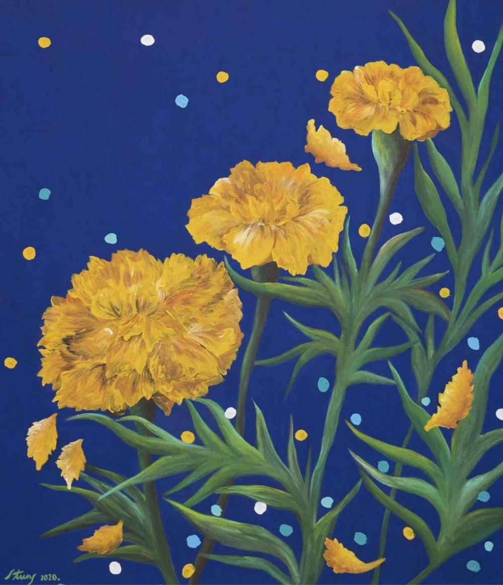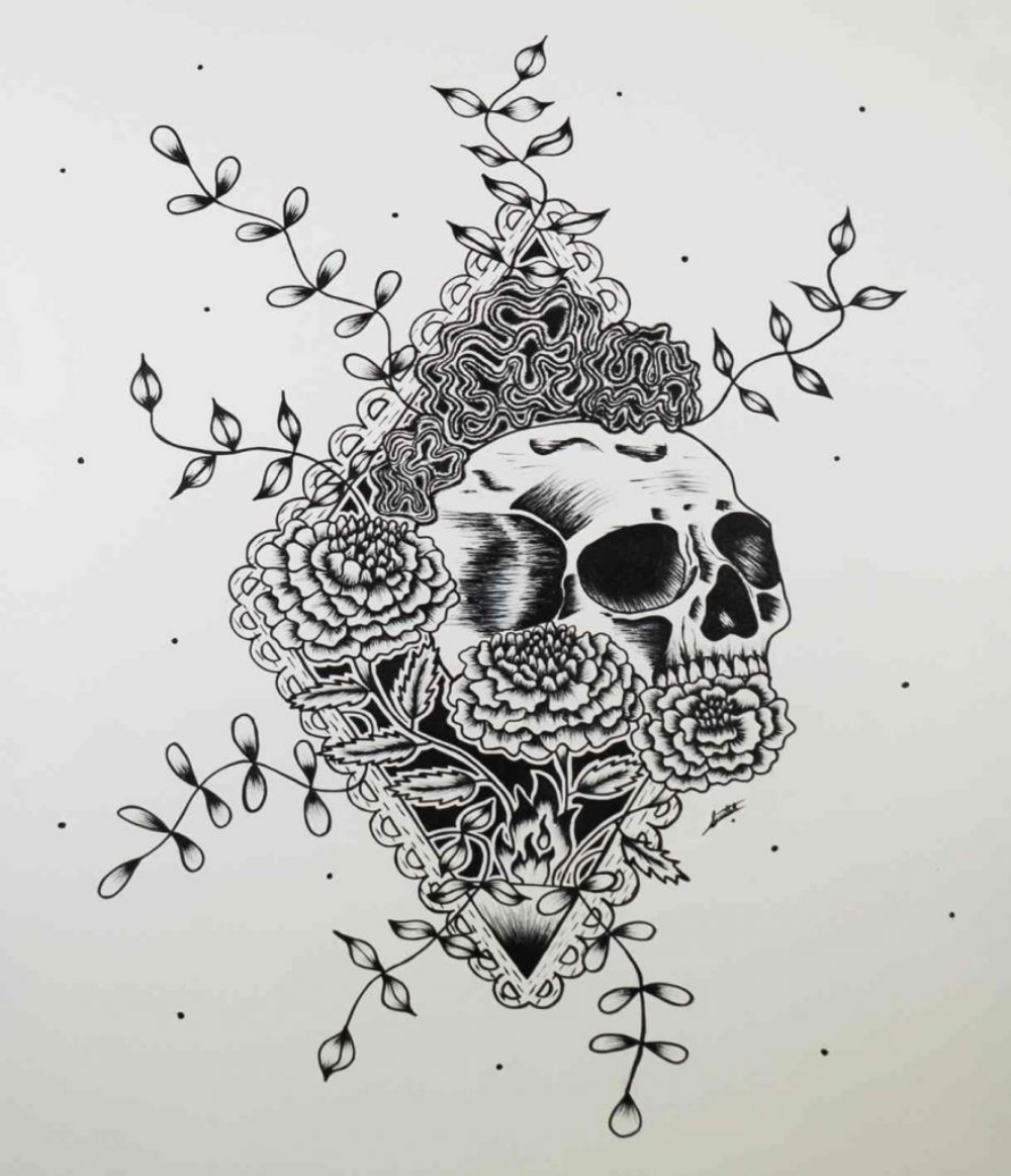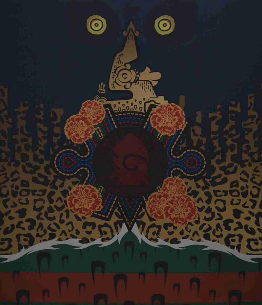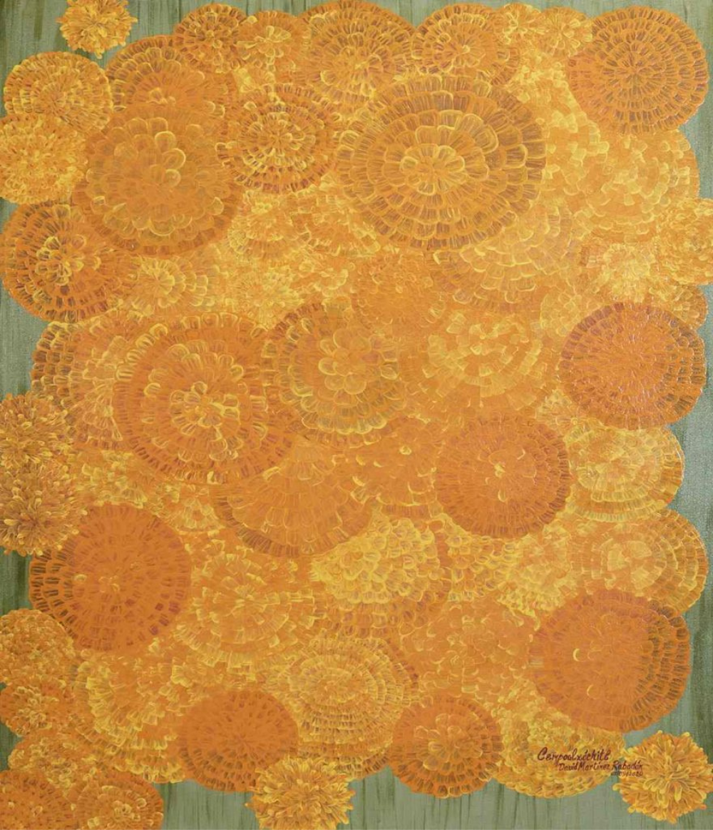 Tomando en cuenta el diseño del cráneo, nos adentramos más a fondo a esta tradición del Día de Muertos y a uno de sus elementos principales, que por lo menos en mi casa, jamás podrá faltar en nuestro altar. En el náhuatl, la flor de Cempasúchil significa flor de veinte pétalos. Cempohualli= veinte y Xochitl=flor. Esta obra es dedicada a todos los que ya no están, para que con estas flores, estos pétalos, puedan encontrar su camino hacia nuestro mundo y regresar con bien al de ellos. Los pétalos les ofrecen el calor del sol y su aroma los guía.