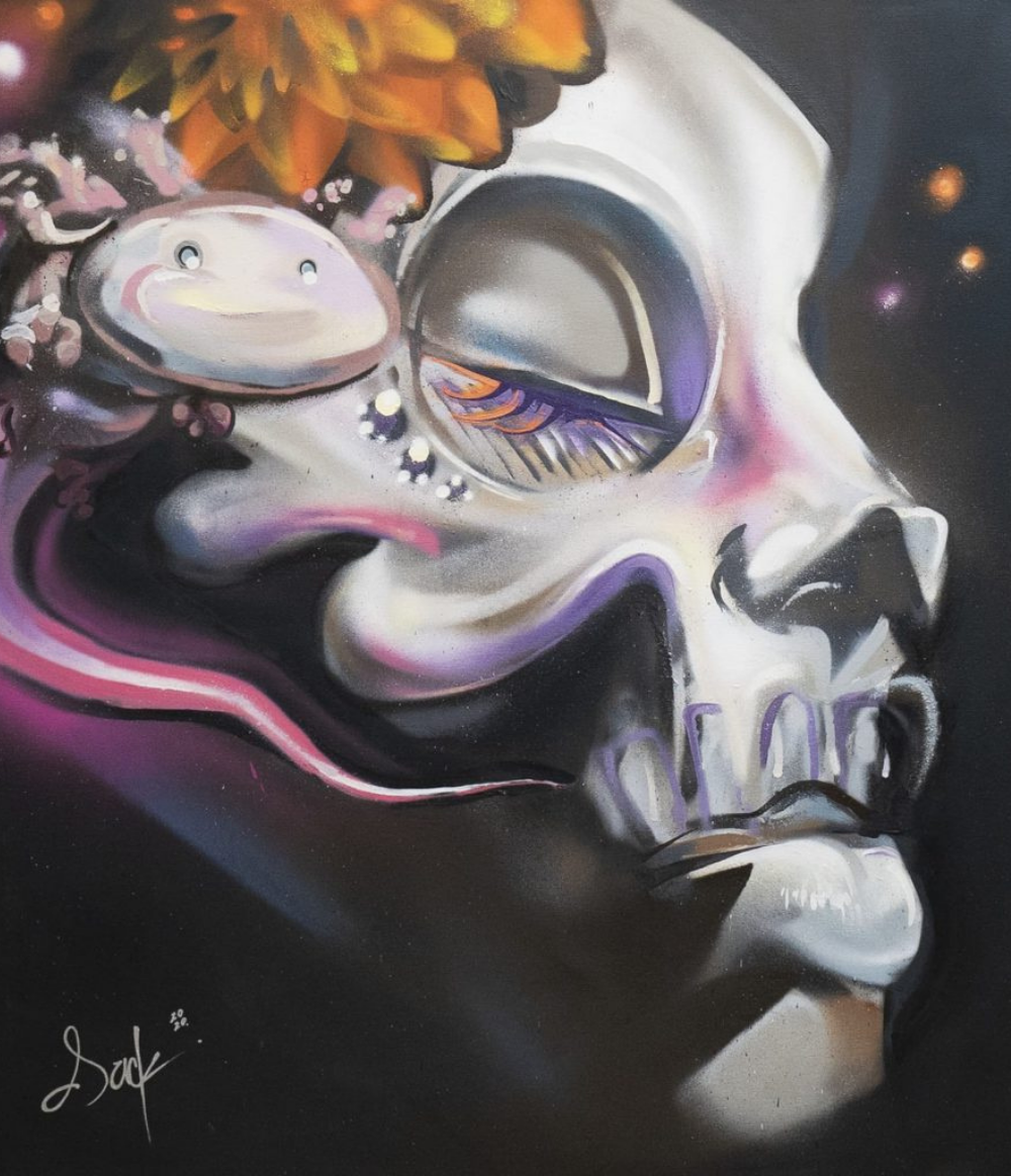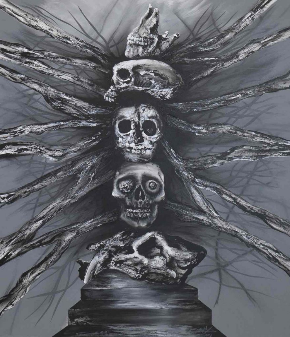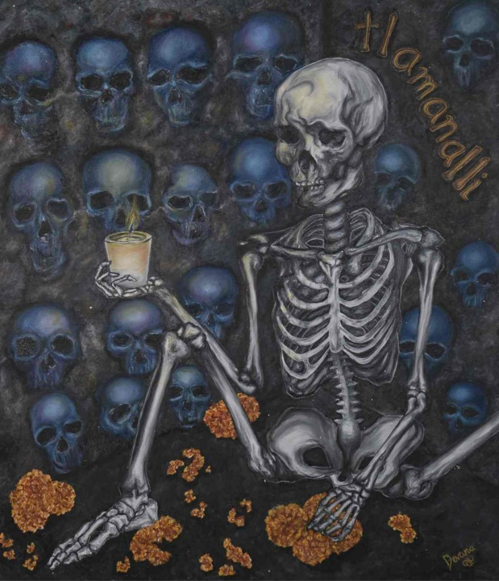 En esta obra busqué plasmar los orígenes de la tradición de Día de Muertos, remontándonos a los conocidos Tzompantli, muros de piedra repletos de cráneos en filas. La luz es representada con una veladora, la cual junto con las flores de cempasúchil dirigen a nuestros antepasados para su reencuentro con nosotros.