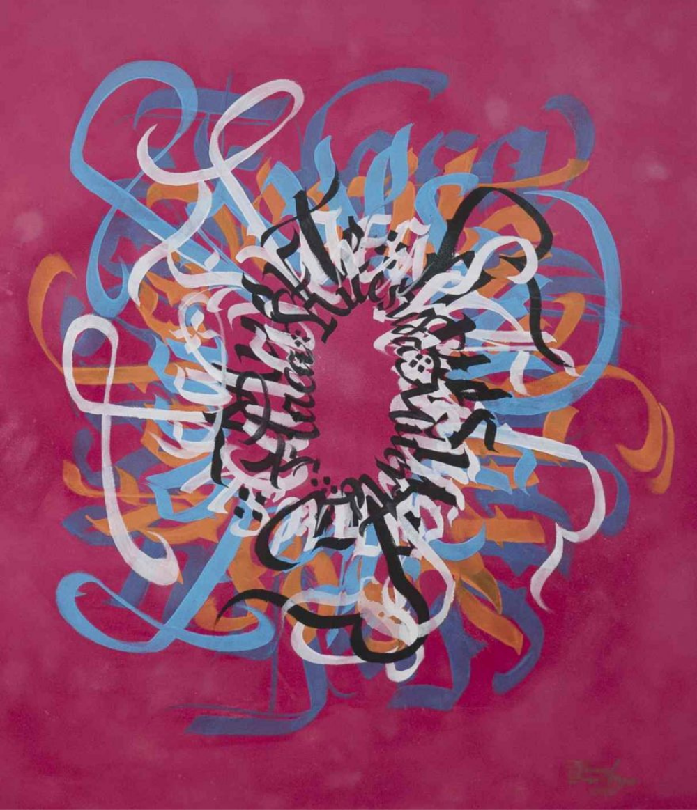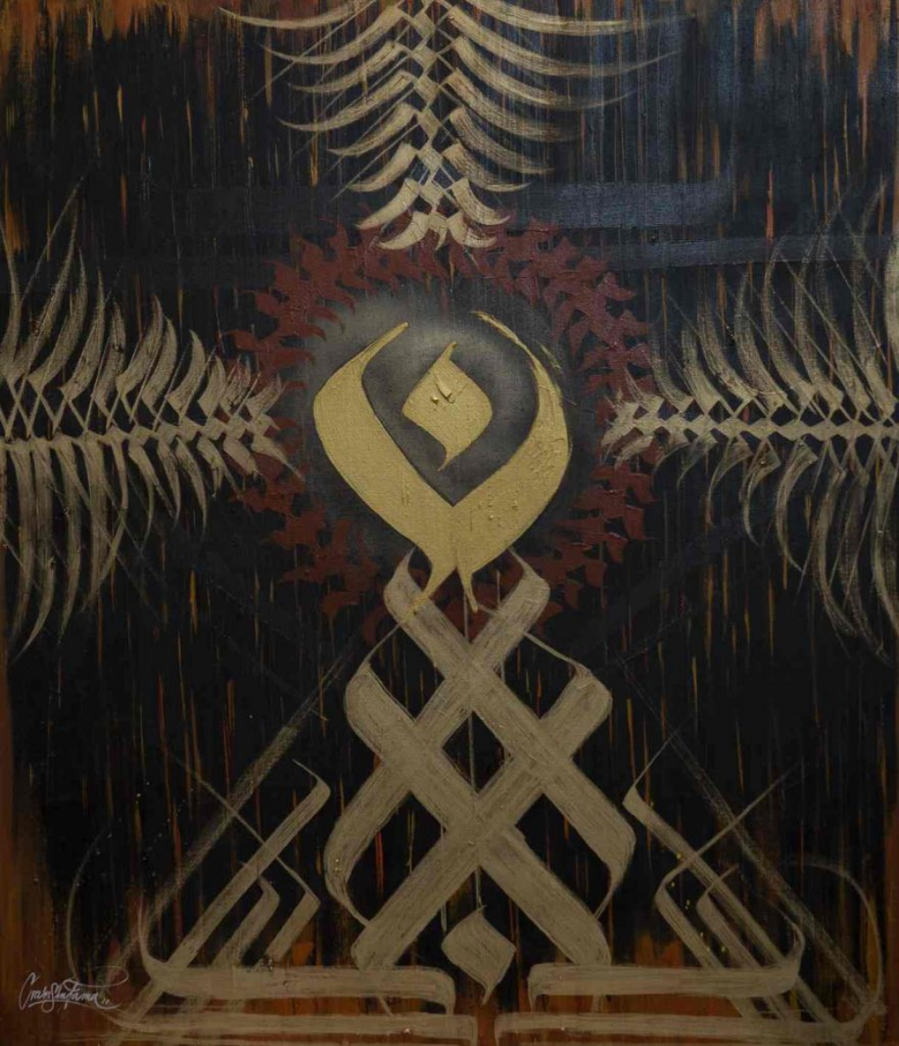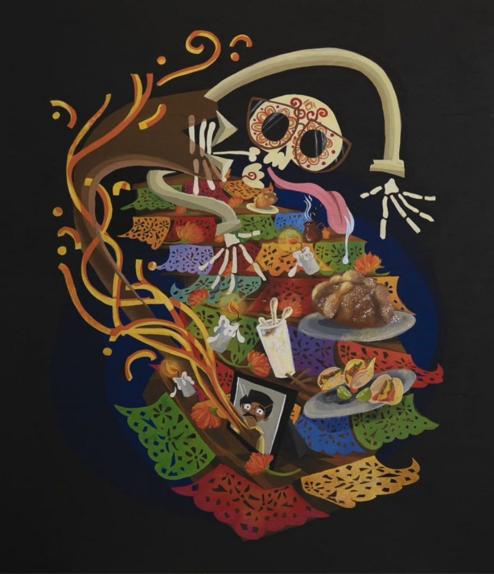 Esta es una obra caligráfica que trata de representar nuestra cultura mediante el uso de las palabras y los colores que nos representan en Día de Muertos. Las palabras con la caligrafía se convierten en una textura de color.