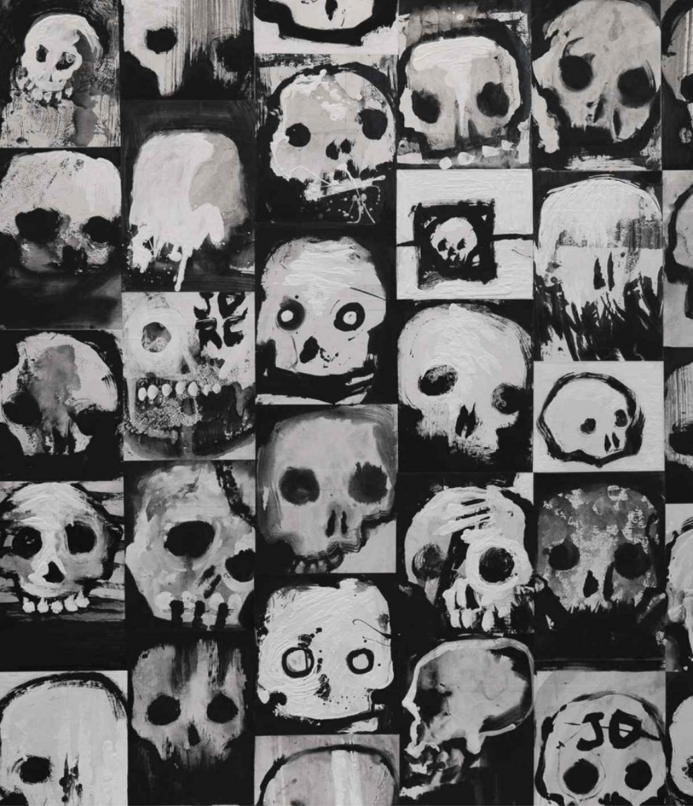 Cada calavera es pintada de forma independiente sobre papel bond con trazos de primera intención, son organizadas en hileras verticales para comunicar la idea de un Tzompantli o una "hilera de cráneos" que en el México antiguo es usado como símbolo ritual del festejo de la vida a través de la muerte, en el Tzompantli se ubican los cráneos de los guerreros muertos en batalla y para el dios sol, el dios de la guerra, esto en un altar ubicado en el Templo Mayor, centro ceremonial de gran jerarquía para el dios Tláloc y para el dios Huitzilopochtli. Los colores blanco y negro con sus grises hacen referencia a los colores terráqueos de los vestigios arqueológicos encontrados actualmente enterrados bajo tierra en el Centro Histórico de la Ciudad e México.