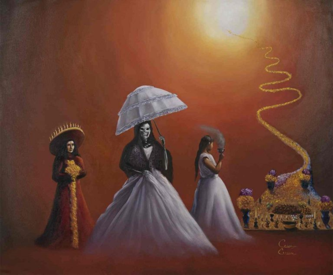 La obra retrata la tradición de la visita al panteón en el día de muertos, donde en varias regiones del país las mujeres acuden con un rebozo o un velo en la cabeza como señal de luto y respeto. A su vez se retrata una tradición nueva como lo es el uso del maquillaje y así convertirnos en calacas por un día.