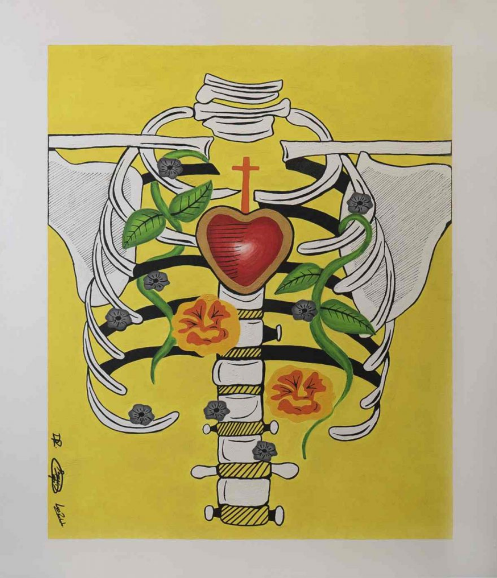 En esta obra busqué plasmar los orígenes de la tradición de Día de Muertos, remontándonos a los conocidos Tzompantli, muros de piedra repletos de cráneos en filas. La luz es representada con una veladora, la cual junto con las flores de cempasúchil dirigen a nuestros antepasados para su reencuentro con nosotros.